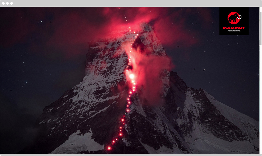 Anlässlich des 150 jährigen Jubiläums zur Erstbesteigung des Matterhorns entstandt ein beeindruckendes Keyvisual im Rahmen der Anzeigenkampagne. Dabei trugen Bergsteiger entlang einer Kette Stirnlampen am Kletterhelm. Ebenso kamen vorinstallierte Lampen zum Einsatz.