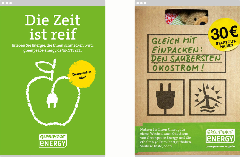 Knackige Botschaften, kämpferisches Image – für Greenpeace Energy, der größten Energiegenossenschaft Deutschlands, werden die Menschen mobilisiert. Über die Imagewerbung bis hin zu Vertriebsaktionen und vom Bauzaun bis zu digitalen Medien.