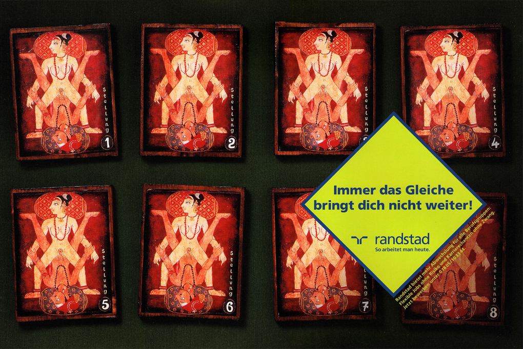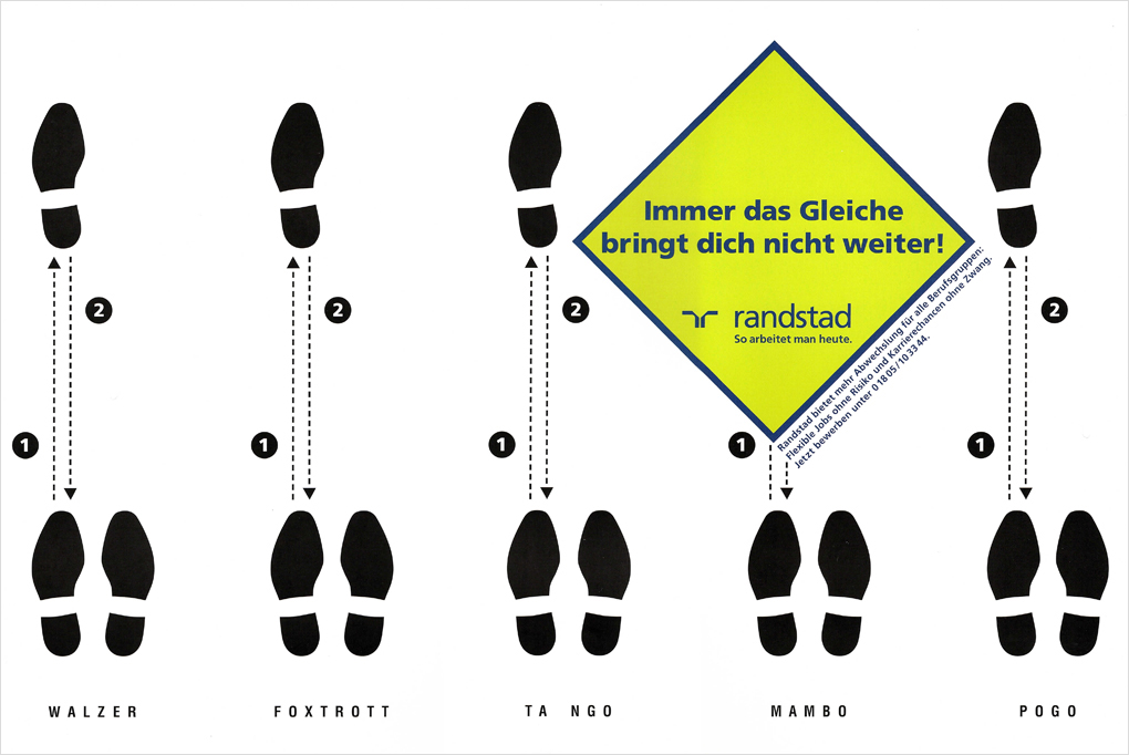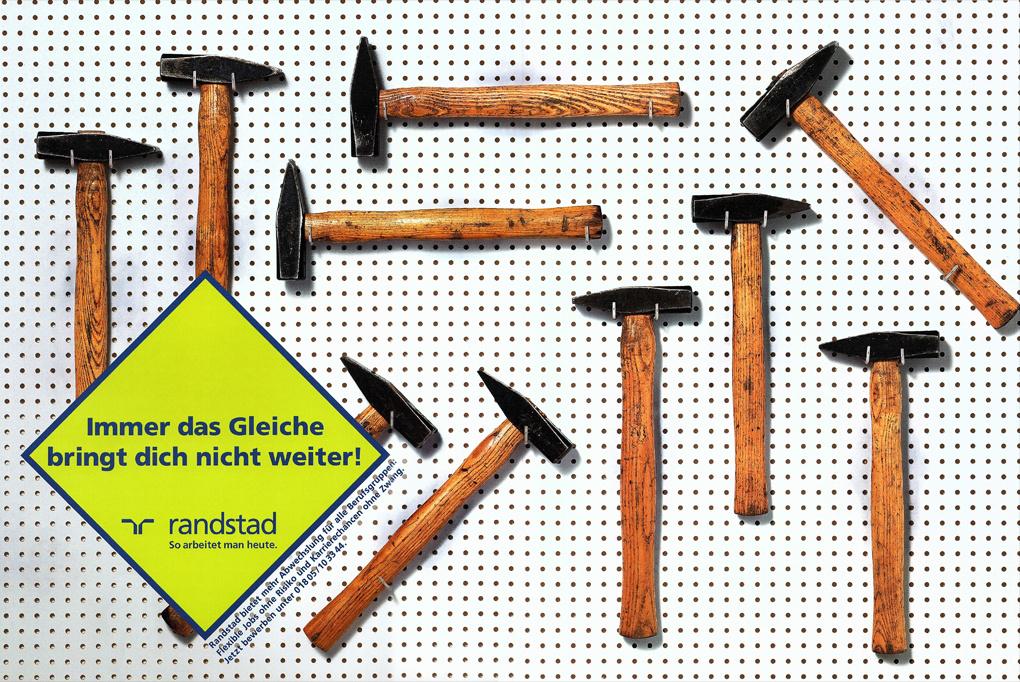 Randstad bietet mehr Abwechslung für die Berufsgruppen: Flexible Jobs ohne Risiko und Karrierechancen ohne Zwang. Unter dem Motto "Immer das Gleiche bringt dich nicht weiter!" wurde mehrere Motive entwickelt.
