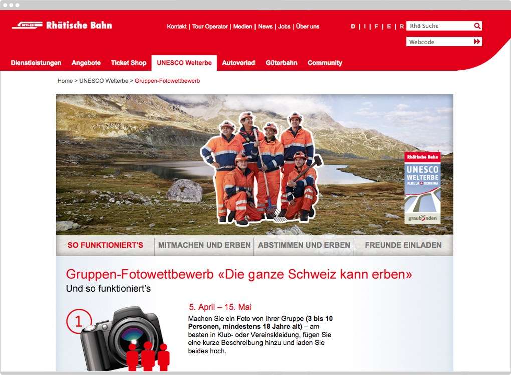 Die UNESCO verlieh der Rhätischen Bahn den Titel UNESCO Welterbe. Unter dem Motto „Die ganz Schweiz kann erben“, wurde eine Involvement-Kampagne entwickelt mit dem Ziel eine Community aufzubauen und zu pflegen. Dazu fand auf Facebook ein Fotowettbewerb statt, wo für die besten Gruppen gevotet werden konnte.